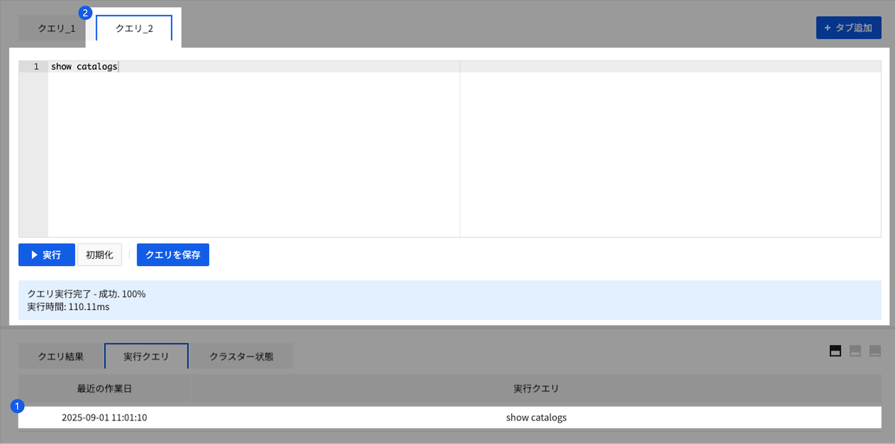 - クエリエディタはクラスタ領域、スキーマ領域、保存されたクエリ領域、エディタ領域、結果/コンソール実行領域に区分されます。