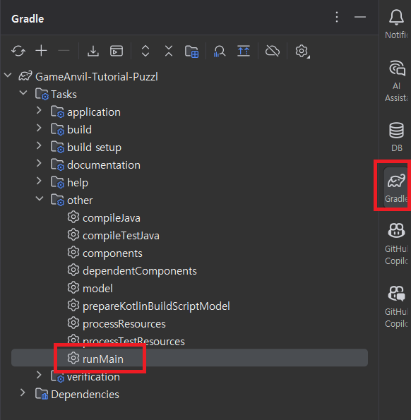 실행 설정이 완료되면 우측의 gradle 메뉴에서 Tasks > other > runMain 실행을 더블 클릭합니다. 이렇게 한 번 실행한 이후에는 IntelliJ 우측 상단의 초록색 삼각형 Run 아이콘을 클릭해도 서버가 실행됩니다.