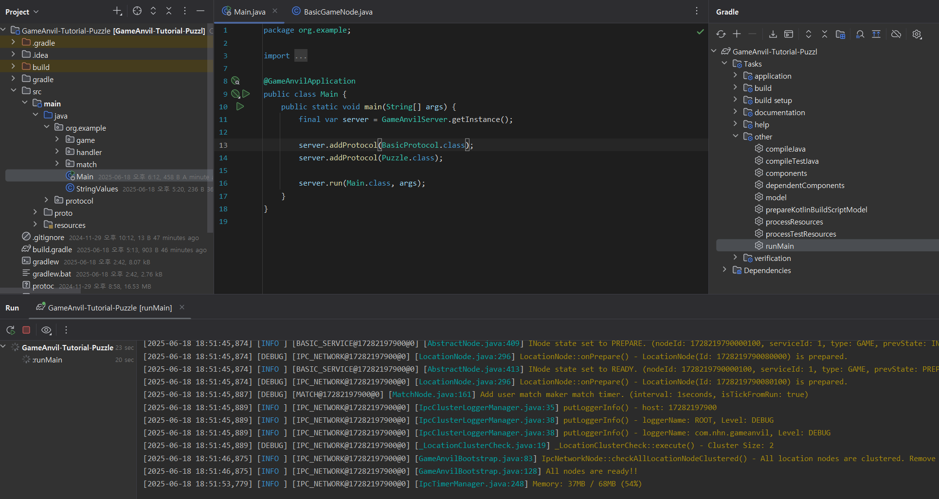 각각의 노드는 코드를 실행하기 위해 준비하는데 시간이 필요하며, 각 노드가 준비 완료되면 onReady 로그를 출력합니다. 클라이언트가 서버로 접속하는데 직접적인 역할을 수행하는 노드는 게이트웨이 노드입니다. 게이트웨이 노드가 준비되어 GatewayNode의 onReady 로그가 출력 되었다면 GameAnvil 서버는 언제든 접속이 가능한 상태가 된 것입니다.