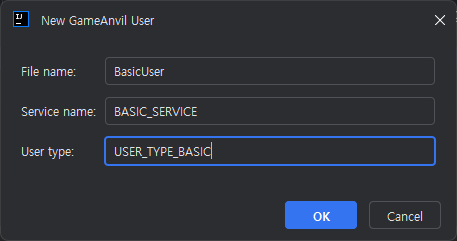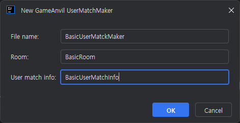 프로젝트 패널의 match 패키지를 마우스 오른쪽 버튼으로 클릭한 뒤 New > GameAnvil UserMatchMaker를 선택합니다. 파일 생성 대화 상자가 열리면 File name에 BasicUserMatchMaker, Room에 BasicRoom, User Match Info에 BasicUserMatchInfo를 입력한 뒤 OK를 클릭합니다.