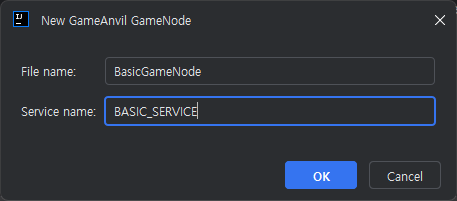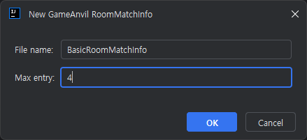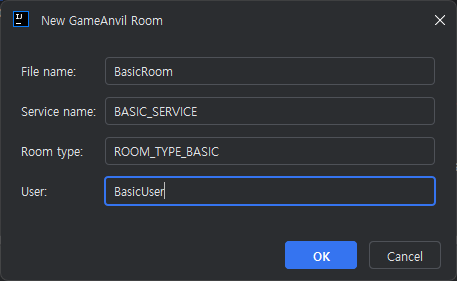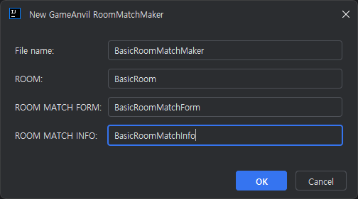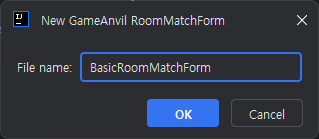 프로젝트 패널의 match 패키지를 마우스 오른쪽 버튼으로 클릭한 뒤 New > GameAnvil RoomMatchForm를 선택합니다. 파일 생성 대화 상자가 열리면 File name에 BasicRoomMatchForm을 입력한 뒤 OK를 클릭합니다.