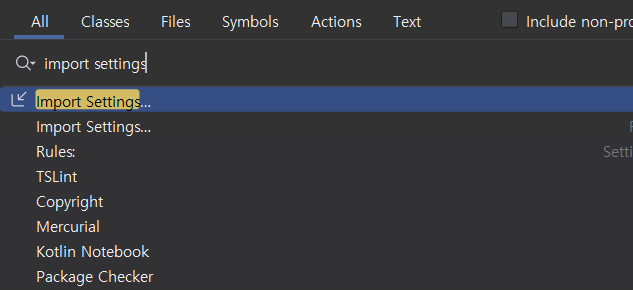 다운로드한 템플릿을 적용하기 위해 IntelliJ를 실행합니다. Welcome to IntelliJ IDEA 화면 좌측 메뉴에서 Customize를 선택한 뒤 Import Settings... 를 클릭합니다. 또는 전체 검색창에서 Import Settings... 를 검색합니다.