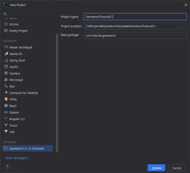 IntelliJ 오른쪽 상단의 버튼 그룹에서 New Project를 클릭한 뒤 왼쪽 목록을 스크롤하여 하단의 Templates에 있는 GameAnvil 2.1.0 Template을 선택합니다. 프로젝트 이름을 설정합니다. 이름에 공백이 있어서는 안 됩니다. 프로젝트 위치를 확인한 뒤 프로젝트를 생성합니다.