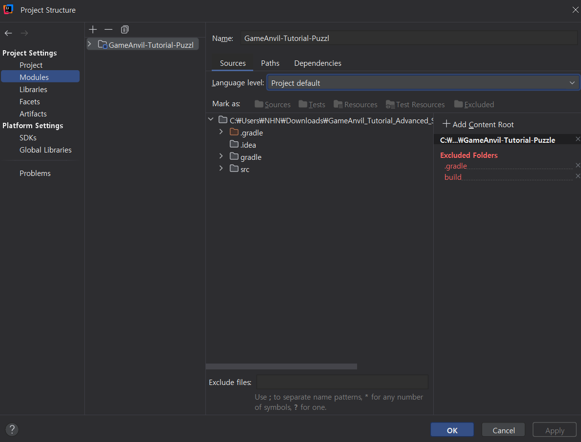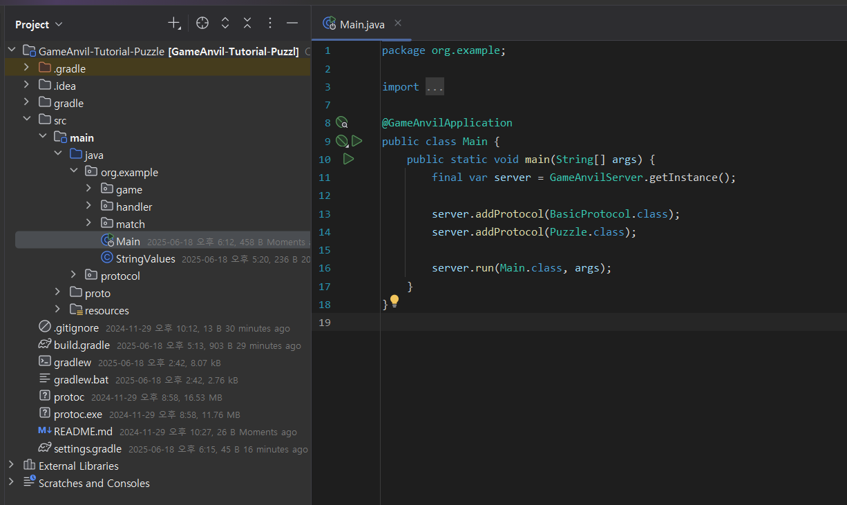 GameAnvil에서는 이와 같은 일련의 과정을 대신해 주는 IntelliJ 템플릿을 제공하여 보다 간단하게 초기 작업을 완료할 수 있습니다. 다음 링크에서 IntelliJ용 프로젝트 파일 템플릿을 다운로드할 수 있습니다. 다운로드한 템플릿은 압축을 풀지 않도록 합니다.