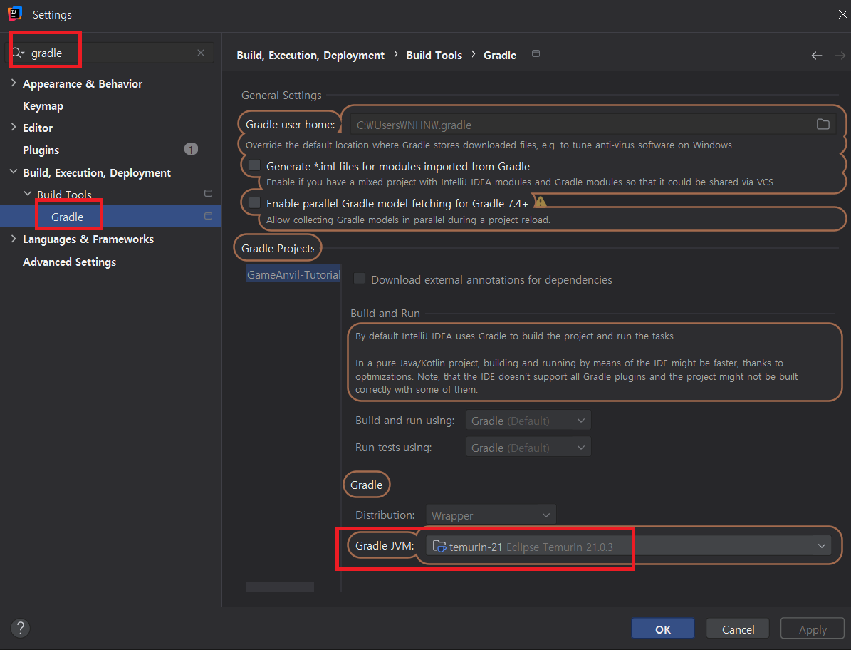 먼저 JDK 설정을 확인합니다. GameAnvil은 Java 21 버전을 지원합니다. 버전에 따라 일부 설정 방법이 다를 수 있으며, 여기에서는 Java 21 버전을 사용하였습니다.